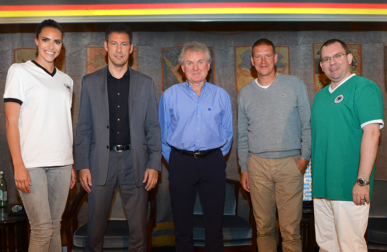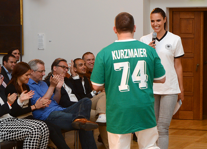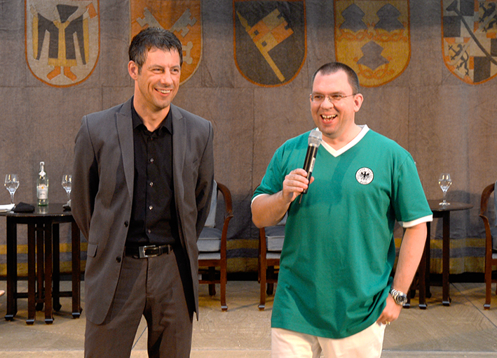 Das Moderatoren-Paar des Abends: Vorsitzender Tobias Kurzmaier (im Original DFB-Auswärtstrikot der Nationalelf von 1974) und von sky Sport HD Esther Sedlaczek (im Original DFB-Heimtrikot von 1974)