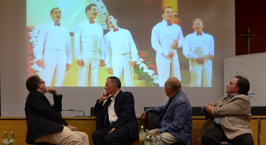 Jeder der drei Podiumsgäste wurde mit einem Ausschnitt aus einem eigenen Film vorgestellt. Hier läuft im Hintergrund "Comedian Harmonists" von 1997. Regie führte Joseph Vilsmaier. Der Film wurde mit 2,8 Mio. Kinobesuchern in Deutschland ein großer Erfolg. Der damalige US-Präsident Bill Clinton ließ sich eine Kopie ins Weiße Haus schicken.
