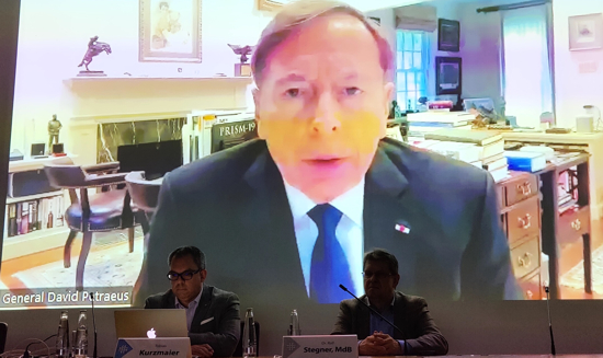 Bevor der Ausschussvorsitzende Dr. Stegner das Wort ergriffen hat, zeigte Vorsitzender Kurzmaier den anwesenden Mitglieder einen rund zehnminütigen Ausschnitt eines Gesprächs, das er mit General a.D. David Petraeus im August 2022 ein Jahr nach der Machtübernahme der Taliban führen konnte. Für den AKWPW war das ein besonderer Moment, den ehemaligen Vier-Sterne-General, CIA-Direktor und Kommandeur der US Forces Afghanistan sowie der ISAF (International Security Assistance Force) in Afghanistan aus seinem Arbeitszimmer in Arlington/Virginia (USA) im Konferenzsaal des Bayerischen Landtags zugeschaltet zu sehen. Die Kernbotschaft des General a.D. lautete: "I would not have withdrawn." ("Ich wäre nicht abgezogen.")
