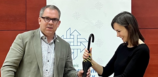 Frau Prof. Costas betonte auch, dass viele der Veränderungen, die die "neue" Arbeitswelt derzeit erfährt, eben nicht neu sind. Vieles davon hätte seine Ursprünge in Japan schon vor Jahrzehnten. "Empowerment", arbeiten in Projektteams, das Ausleben von Interessen seitens der Mitarbeiter, Wohlfühlangebote des Arbeitgebers wie z.B. Yoga am Arbeitsplatz, gemeinsamer Marathonlauf, Kickertisch im Büro, lockerer Kleidungsstil, duzen statt siezen etc. - alles das wäre gar nicht so neu. Was verstärkt in Deutschland seitens der Arbeitnehmer aktuell nachgefragt wird, sind oftmals eine 4-Tage-Woche und Arbeiten von zuhause aus (Home Office). Letzteres hätte insbesondere die Corona-Pandemie intensiviert. Fazit der Ausführungen war: 1. Die Arbeitsstelle/der Arbeitsplatz wird immer mehr zum Selbstverwirklichungsort des Arbeitnehmers. 2. In einer erfolgreichen Arbeitswelt braucht es mehr Freiräume für den Arbeitnehmer und weniger Bürokratie und Hierarchie, die die Kreativität am Arbeitsplatz ersticken. 3. Konstruktive Kritik am Arbeitgeber, am eigenen Unternehmen ist der Motor für interne Veränderungen. Wie jede(r) Referent(in) beim Aktionskreis erhielt auch Frau Prof. Costas aus den Händen des Vorsitzenden Tobias Kurzmaier das traditionelle Gastgeschenk, den AKWPW-Regenschirm.