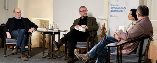 Das Quartett bestand erneut aus v.l.n.r. Dr. Klaus Beckschulte (Geschäftsführer Börsenverein des Deutschen Buchhandels Landesverband Bayern e.V.), Michael Lemling (Geschäftsführer Buchhandlung Lehmkuhl München-Schwabing), Sonja Zekri (Kultur-Korrespondentin Süddeutsche Zeitung), Tobias Kurzmaier (Vorsitzender Aktionskreis für Wirtschaft, Politik und Wissenschaft e.V.).