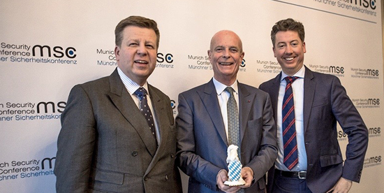 Vorsitzender Tobias Kurzmaier war auf Grund einer Auslandsreise verhindert, konnte sich aber 100% auf seinen Stellvertreter Dr. Benedikt Franke (Geschäftsführer der Münchner Sicherheitskonferenz) und den Sprecher des Beirats Robert Brannekämper, MdL verlassen. Aus ihren Händen erhielt Sir John als Gastgeschenk den traditionellen bayerischen Löwen aus Porzellan.