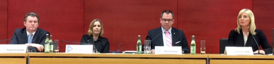 Auf dem Podium der fast vollzählige Vorstand mit dem Ehrengast: Hans-Georg Augustinowski (Schatzmeister), Karen Otto (Schriftführerin), Tobias Kurzmaier (Vorsitzender) und Staatsministerin Ulrike Scharf, MdL. Es fehlt Dr. Benedikt Franke (stellvertretender Vorsitzender).
