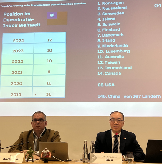 Die internationale Wochenzeitung "The Economist" führt im aktuellen weltweiten Demokratie-Index Taiwan auf Platz 12 von 167 Ländern. Deutschland liegt auf Platz 13, China auf Platz 145. Taiwan muss derzeit 2,5 Millionen Cyberangriffe aus China abwehren - täglich! Die Wirtschaft des Landes, das flächenmäßig ungefähr so groß wie Baden-Württemberg ist, mit seinen rund 24 Mio. Einwohner ist erfolgreich und verzeichnete 2024 ein Wirtschaftswachstum von +4,59%. Seit der Demokratisierung Taiwans 1996 lautet das Erfolgsrezept des Landes Herrn Dr. Dieu zufolge "von der Freiheit zur Rechtsstaatlichkeit zur Innovation". Für eine Überraschung in der Zuhörerschaft sorgte Dr. Dieu mit dem Hinweis, dass Taiwan sich bei der Wieder- bzw. Neueinführung seiner Verfassung von 1946, die die Weimarer zum Vorbild hatte, an der des Freistaats Bayern orientiert hat. In der Verfassung Taiwans gibt es einige Rechte und Aufgaben, die der bayerischen sehr ähneln. Eine signifikante Parallele laut Dr. Dieu ist auch, dass es sowohl in Taiwan als auch Deutschland das System der dualen Berufsausbildung gibt.