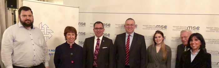v.l.n.r.: Andreas Goppel (Beirat), The Rt. Honorable Baroness Catherine Ashton of Upholland, Tobias Kurzmaier (Vorsitzender), Hans Fritz (Beirat), Christina Ludwig (Beirat), Wolfgang Schichtel (Beirat), Gabriele Appel (Beirat)