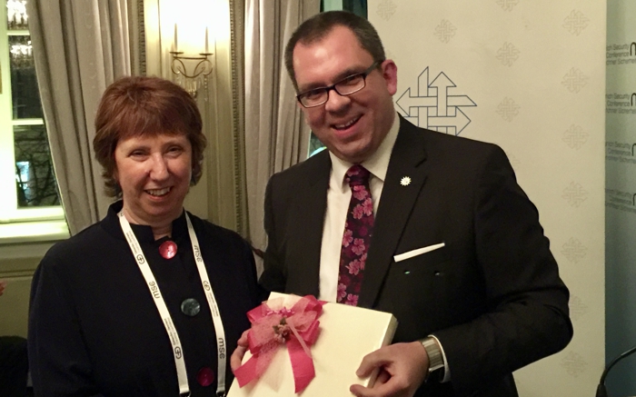 Das traditionelle Gastgeschenk des AKWPW gab es diesmal ausnahmsweise nicht für Baroness Ashton. Vorsitzender Tobias Kurzmaier meinte, es wäre ironisch, einer Dame aus Großbritannien einen Regenschirm zu schenken. Dafür überreichte er der Baronin eine Selektion feiner Elly Seidl-Pralinen aus München.